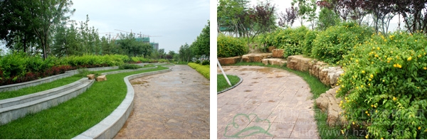 為了配合每個景觀節點的風格,園路的鋪裝材料和手法各不相同。據高經理介紹,工程中用到的鋪裝材料主要有汀布石、印花地坪、文化石、青磚、荷蘭磚、花崗巖等,其中,印花地坪是一種新型的鋪裝材料。“印花地坪主要用在北廣場上,其工藝為:在混凝土上面灑上特殊的配料,整平之后,再用模具一塊一塊壓出形狀,最后用特殊的膠水封膜,這種施工方法工藝新穎,花樣和顏色比較多,雖然工藝較為復雜,但是景觀效果非常好,遠遠看去,就如盛開在腳下的‘花?!?,一路迤邐而去?!备呓浝碚f,“其他的鋪裝材料雖然比較常見,但我們在鋪裝工藝上進行了創新,如在下沉廣場的廊架旁,我們用黑色的鵝卵石與芝麻灰的花崗巖搭配,鋪出來的路面呈現出立體感,這種鋪裝工藝是借鑒了室內裝飾的手法,通過改造,用于室外鋪裝,遠遠看去,就像一級一級的臺階,帶動了周圍的景觀也動起來?!?/p>