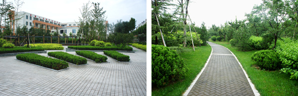 而在道路十字路口的節(jié)點(diǎn)處,則主要是用10cm×10cm的小花崗巖鋪地,鋪出來的路面整潔、平坦,看似簡單,實(shí)則對(duì)施工技術(shù)要求相當(dāng)高。草坪中的地面鋪裝,則采用花崗巖汀步,用錯(cuò)縫鋪裝法,兩塊花崗巖之間用草皮鑲嵌,就像給每塊花崗巖鑲了一道綠邊,與旁邊的草坪和諧地融為一體。貫穿整個(gè)工程的游憩步道,全部采用"人字形"的鋪裝方法,中間用透水磚、兩邊以花崗巖鑲邊,透水磚價(jià)格不高,用以鑲邊的花崗巖是利用了鋪裝中剩余的邊料,雖然用料簡單,但通過對(duì)技術(shù)的嚴(yán)格要求,鋪出的路面卻整潔而不失韻味,是一種實(shí)用、環(huán)保、節(jié)約的做法。