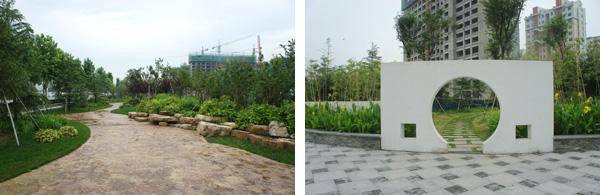 每個(gè)景觀節(jié)點(diǎn)上,植物的配置方法都是不一樣的,如在下沉廣場,主要是以小龍柏、金葉女貞等小灌木片植成方形或弧形,間或點(diǎn)綴石楠、梅樹,看起來規(guī)整、簡潔;而在設(shè)計(jì)風(fēng)格為江南園林的南廣場上,是將貴重的造型油松單植,通過不同的組合,形成三個(gè)風(fēng)格相近的綠島,周邊種植美人蕉、玉簪、竹子,并砌起白墻,上面開圓形拱門或圓窗,散發(fā)出詩意江南的靜謐和婉約氣息。"游憩步道是貫穿整個(gè)景觀的軸線,為了形成曲徑通幽的景觀效果,我們將對(duì)植、孤植、叢植都多種方法結(jié)合運(yùn)用,特別是在三叉路口,多種植海棠、櫻花、杏花等,一方面,花開的時(shí)候,綠葉間繁花點(diǎn)點(diǎn),會(huì)吸引人們不斷向前探尋更多的美景;而花落之后,茂密的枝葉又形成隱隱約約的視覺感受,前方轉(zhuǎn)過彎后風(fēng)景什么樣,又讓人很想去看看。"高經(jīng)理笑著說。