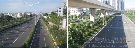 國道205深圳段改建工程景觀綠化工程G5402標段,是深圳市龍崗區迎大運重點景觀工程,位于國道205深圳段龍崗區地鐵三號線愛聯地鐵站至坪地與惠州市交界處,總綠化面積210000㎡。“以人為本,尊重自然”、“ 處處有綠葉、無處不飛花”等設計理念貫穿于工程始終,整條中央綠化帶位于高架橋下,長勢茂盛的各類植物形成一條色彩繽紛的彩帶擁簇著高架橋段,使整條橋段與綠化景觀有機融合。整條道路的景觀,不僅體顯出一個濱海大都市獨有的景觀特色,更彰顯出這個城市的生機活力與熱情奔放。