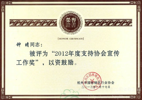 近日,杭州市園林綠化行業協會對2012年度在協會宣傳工作中表現優異的通訊員進行了表彰。其中,杭州市園林綠化工程有限公司企劃部鐘晴同志榮獲“2012年度支持協會宣傳工作獎”,梁夕雯同志被授予“2012年度杭州市園林綠化行業協會優秀通訊員”稱號。