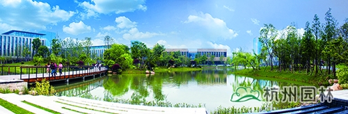 華為杭州二期生產(chǎn)基地景觀工程位于杭州市濱江區(qū)。走進(jìn)工程現(xiàn)場(chǎng),只見一棵棵銀杏、香樟、桂花生長(zhǎng)得郁郁蔥蔥,昭示著無限的生機(jī)與活力;風(fēng)格多樣的鋪裝,相映成趣,蜿蜒延伸;波光粼粼的人工湖中,幾只黑天鵝悠閑地游來游去,是風(fēng)景的主角;色彩繽紛的黃色、白色、粉色花朵,營(yíng)造出夏日的花海景觀……不是公園勝似公園的園林美景,營(yíng)造出一個(gè)郊外原野般的自然空間。