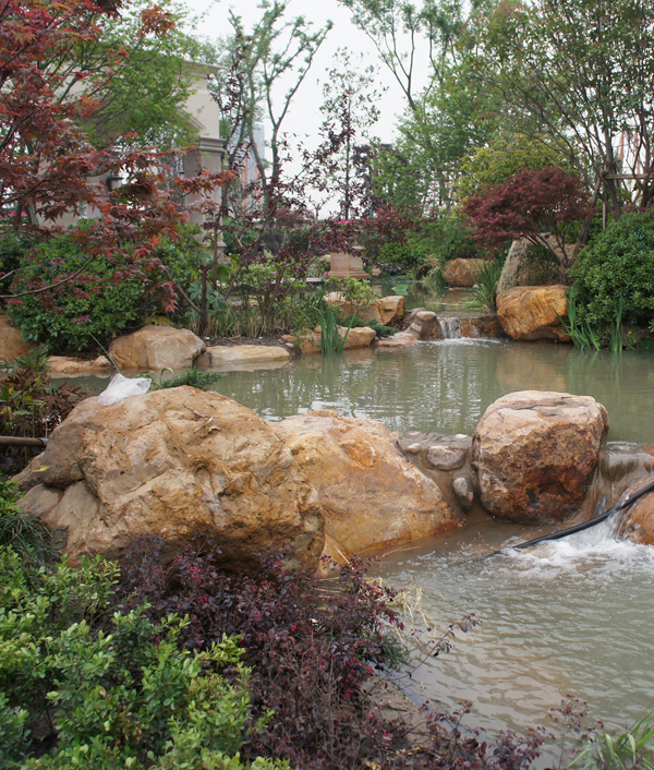 此外,景石的布置也是施工人員反復斟酌的問題,如何使景石的布置做到師法自然,對水流有阻有攔、動靜結合,如何做到相石立景、主次分明,如何使景石的大小、高低、間距的分布錯落有致,如何使硬質景觀與軟質景觀完美結合等,項目部都進行了周密的考慮。