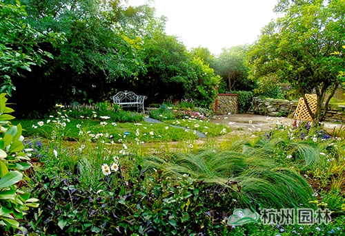 擋墻后采用柳葉馬鞭草+翠蘆莉分帶種植,并點綴穗花牡荊的手法,形成錯落有序、整齊卻不單調的英式鄉村院落景觀。