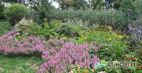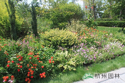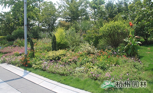 人來人往的杭州火車東站西廣場,草坪碧綠,樹木蔥郁,更有一座名為“西湖印象”的立體花壇吸引著眾多游客的眼。而在廣場通往天城路方向的一片草坪里,一處100平方米左右的花境小品卻格外引人注目,紅黃粉交相輝映的五色梅、葉秀花艷的香彩雀、紫色優雅的翠蘆莉、飄逸秀氣的小兔子狼尾草、青翠挺立的直立冬青、葉色嫩黃的黃金香柳……豐富的品種,艷麗的色彩,既展現出植物的色彩美,又營造出豐富的群落美,使得這處小花境成為這片風景的點晴之筆。