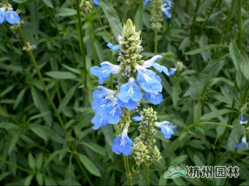 天藍鼠尾草,花天藍色,開花植株高達1米5,花期春季。喜溫暖,陽光充足的環境,不擇土壤,耐干旱,但不耐澇,特別喜石灰質豐富、或沙性、排水良好的土壤。