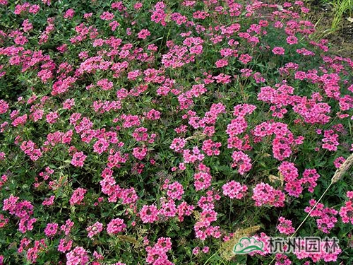 美女櫻,其姿態優美,花色豐富,色彩艷麗,盛開時如花海一樣,令人流連忘返。美人櫻株叢矮密,花繁色艷,開花部分呈傘房狀,花色有白、紅、藍、雪青、粉紅等,花期為5-11月。喜陽光、不耐陰,較耐寒、耐蔭差、不耐旱?;ㄆ诳蓢娏姿岫溻?,促進花開放。