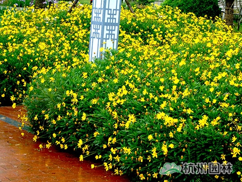 黃金菊花色金黃,在花境中色彩突出。其高度可達(dá)1.5m,可做花境背景材料、花境前景焦點(diǎn)材料,也可大片單獨(dú)種植。