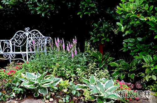 英式花境中,以穗花婆婆納為焦點(diǎn),通過花葉玉簪、礬根、檸檬羅勒、紅尾鐵莧、花葉絡(luò)石的配置,并與鐵藝座椅形成愜意的休閑氛圍。