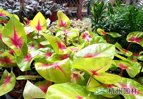 花葉芋:紅與黃交織的葉面色彩絢麗奪目,充滿了生機和活力,讓人的心情瞬間明亮起來。