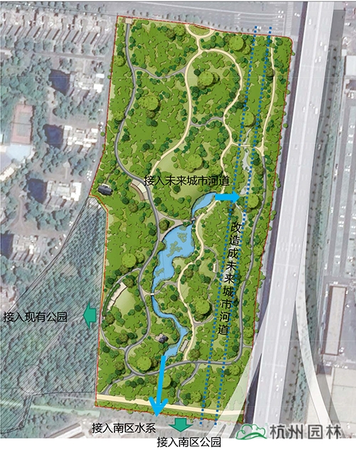 江干區東湖路市民公園位于東湖路與九喬街西南角,毗鄰九月庭院和泊林印象小區,是江干區“一帶生態功能區”的“運河—錢塘江—東湖路”U型生態軸的重要節點。結合已建成公園和高架互通施工預留地,對東湖路市民公園進行統一規劃。