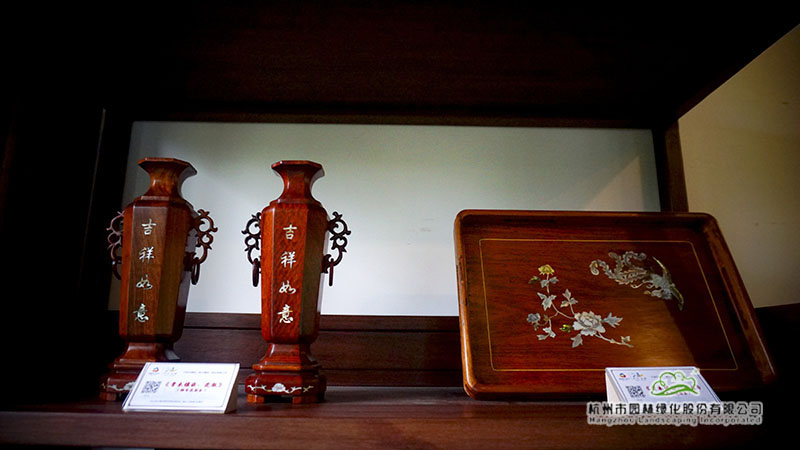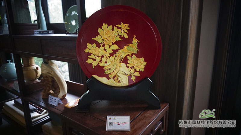 在浙江園的富春山居內,泥金彩漆、骨木鑲嵌、金銀彩繡等非遺展品也一并展出。泥金彩漆是寧波傳統的“三金”工藝之一,現主要分布于寧波市及其周邊地區。而骨木鑲嵌則是在木器表面嵌入動物骨骼進行裝飾,也是寧波的一門特色手工藝。金銀彩繡則是在真絲面料上用各色彩線繡制、金線和銀線盤繡而成的漢族民間手工藝品之一。這些非遺展品展現了寧波深厚的文化底蘊與人文精神。