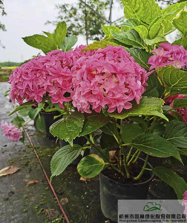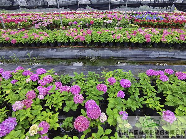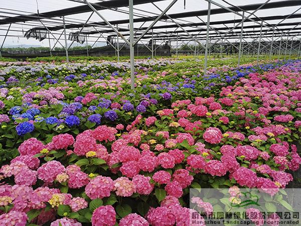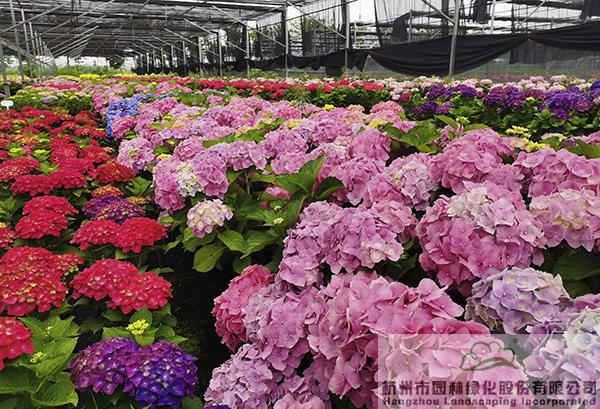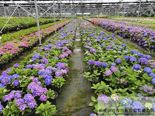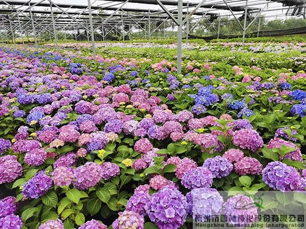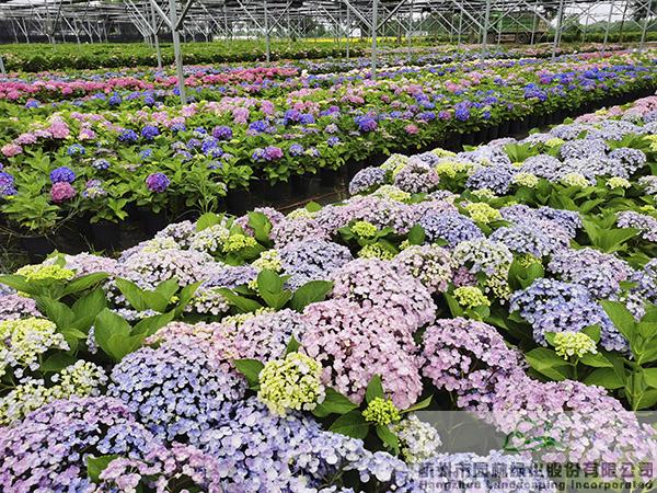 據悉,在畫境種業徑山基地,共有七八十個繡球品種,規格從1加侖到5加侖,能夠滿足家庭園藝和工程用苗的多種需求。通過近幾年的生產和繁育,徑山基地不斷篩選優良的繡球品種,目前,基地里的這些品種表現都比較好,比如紅色系的搖擺樂、漢堡、花神,花色紅艷,花朵碩大,在一眾繡球中表現非常搶眼;花色豐富多變、宛如一顆顆璀璨寶石的藍寶石和藍色媽媽;花朵宛如蝴蝶翩躚、花色充滿夢幻感的佳澄;花朵密集、猶如一大捧五顏六色爆米花的愛莎;開花早、花期長、花色漸變的藍色海洋;花開時,宛如一只只白色小鳥在枝頭紛飛的泉鳥;花團錦簇、花期超長的無盡夏……可以說,每一種繡球的花色、花形都各不相同,極具特色,充滿了夏日的浪漫情懷。
