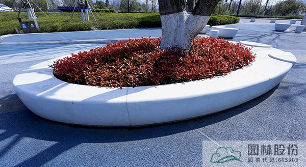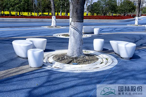 造型豐富美觀的泰科石坐凳和樹池是項目中的一大亮點。在波紋廣場和兒童樂園等地方,采用高強度復合無機泰科石材料,造型為圓形、橢圓形、異形的各種坐凳和樹池,錯落有致地分布,潔白的顏色與彩色的混凝土鋪裝相映成趣,既可以作為行人休憩的地方,又成為景觀的一部分。這些坐凳和樹池均以模具工藝成形,造型美觀,集現代休閑與實用功能于一體,表面光滑平整,自潔性好,抗污染強,維護簡單,只需擦拭后水管沖洗即可。
